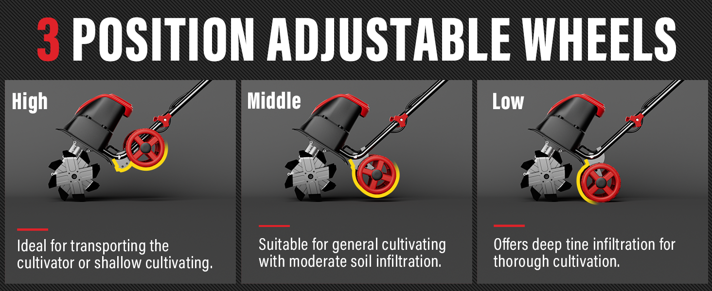 - [Adjustable Wheels for Versatility]:MZK cultivator comes with adjustable wheels and three height settings, allowing you to easily switch between different tasks. Whether you're maintaining soil or planting seeds, you can customize the depth for better control and performance.