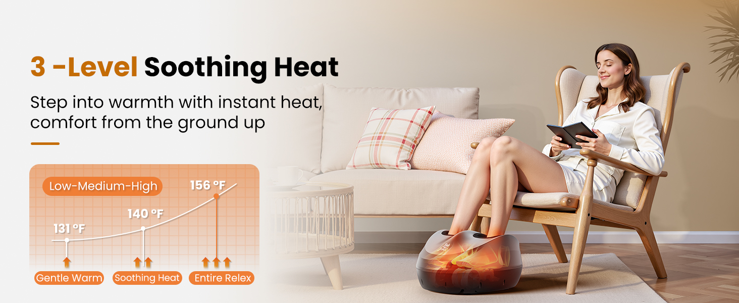 - Soothing Heat Function for Relaxation and Pain Relief: Enhance your massage experience with the built-in heating feature, offering 3 temperature settings (131°F, 140°F, 156°F). The gentle warmth helps to relax tight muscles, improve blood circulation, and provide relief from foot pain, swelling, and stiffness. Whether you're looking to unwind after a long day or soothe sore feet from physical activities, this heated foot massager is your perfect companion for ultimate relaxation and recovery.