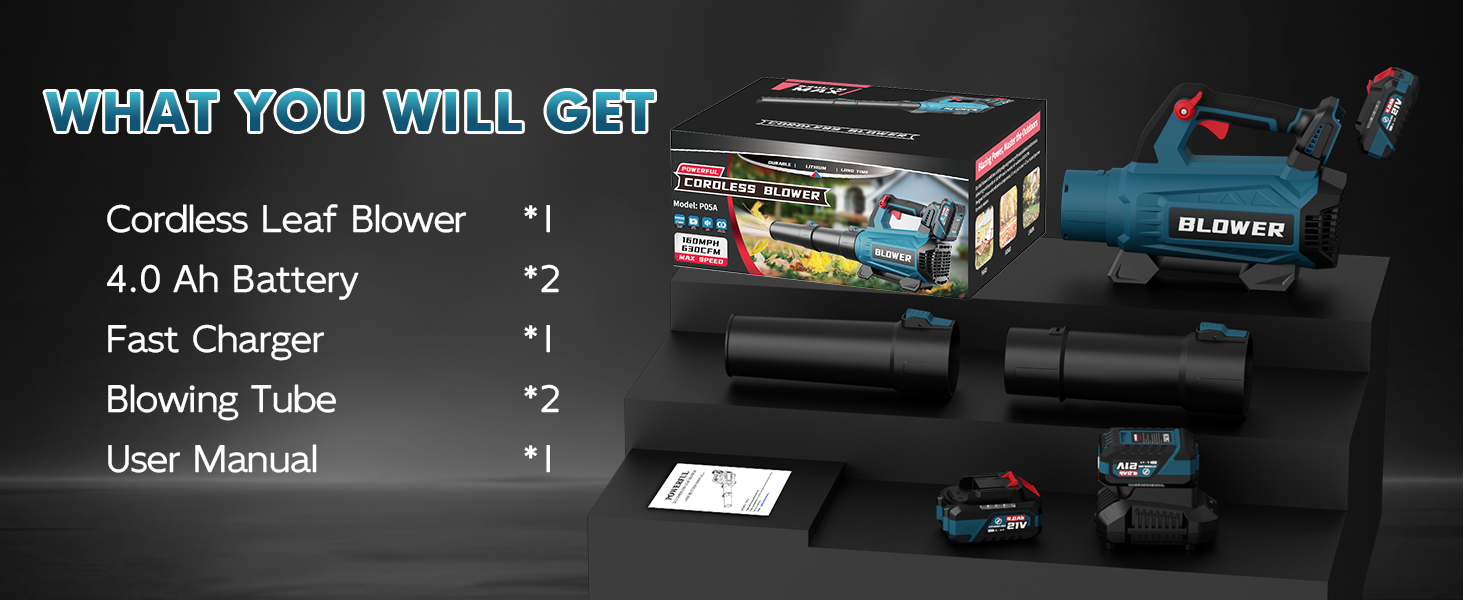 - What You Will Get - Exquisite cordless leaf blower present box, which includes 1*leaf blower, 1*blower tube, 1*extension tube, 2*Batteries, 1*fast charger, 1*user manual. The battery is not fully charged, please fully charge the battery upon receiving the product before use. Please wait 5-10 minutes after discharging before charging. Tips: 12-Month Warranti is available. If you have any problems while using our cordless leaf blower, please reach out to us
