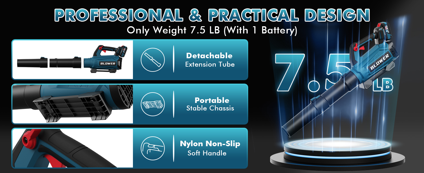 - Easy to Operate & Quick Assembly - This cordless blower weighs only 7.5 pounds (with a 4.0Ah battery), featuring a nylon anti-slip ergonomic handle for added comfort and convenient one-handed operation. Portable chassis allows you to place the leaf blower aside when you need a break without worrying about it getting dirty. It can be assembled in seconds, just install the blower tube, extension tube, and battery to start the leaf blower