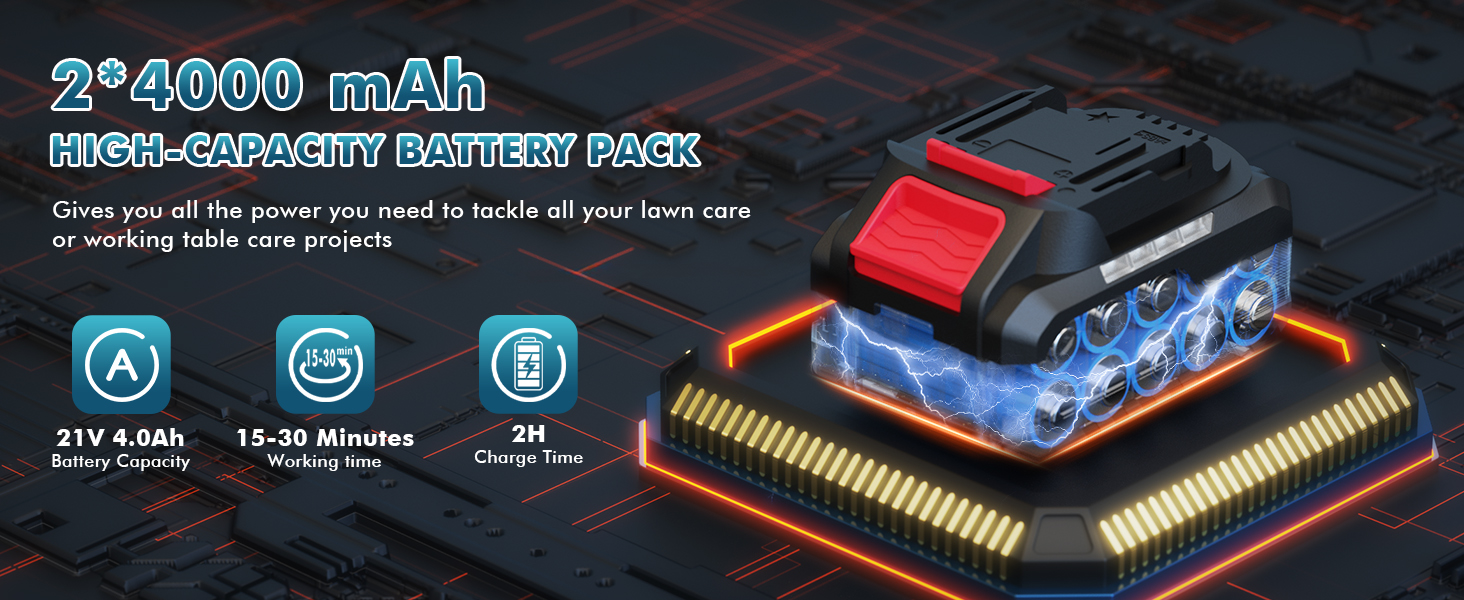 - Upgrade to 2 x 21V 4.0 Ah Batteries - GROWORT leaf blower is equipped with 2*21V 4000mAh batteries to ensure a longer running time. It can run for up to 30 minutes in high-speed mode (15 minutes for each battery). The batteries are equipped with overheat protection, which is safe and reliable. The power indicator light enables you to keep track of the power status at any time. Bonus the fast charger, which can fully charge the battery within 2 hours