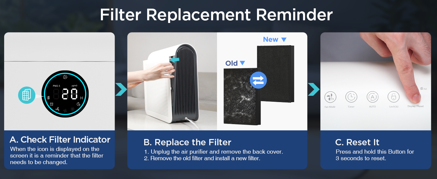 - FILTER REPLACEMENT REMINDER: This air purifier with washable filter has a filter change reminder function. When the filter reaches the end of its service life, the filter indicator lights up to remind you to replace the filter. You can also clean the pre-filter to extend the its service life. We recommend replacing the filter every 3-6 months and using the official DBFIT filter to ensure optimum performance. (The official replacement filter can be purchased on Amazon by searching B0DFCLG2JL.)