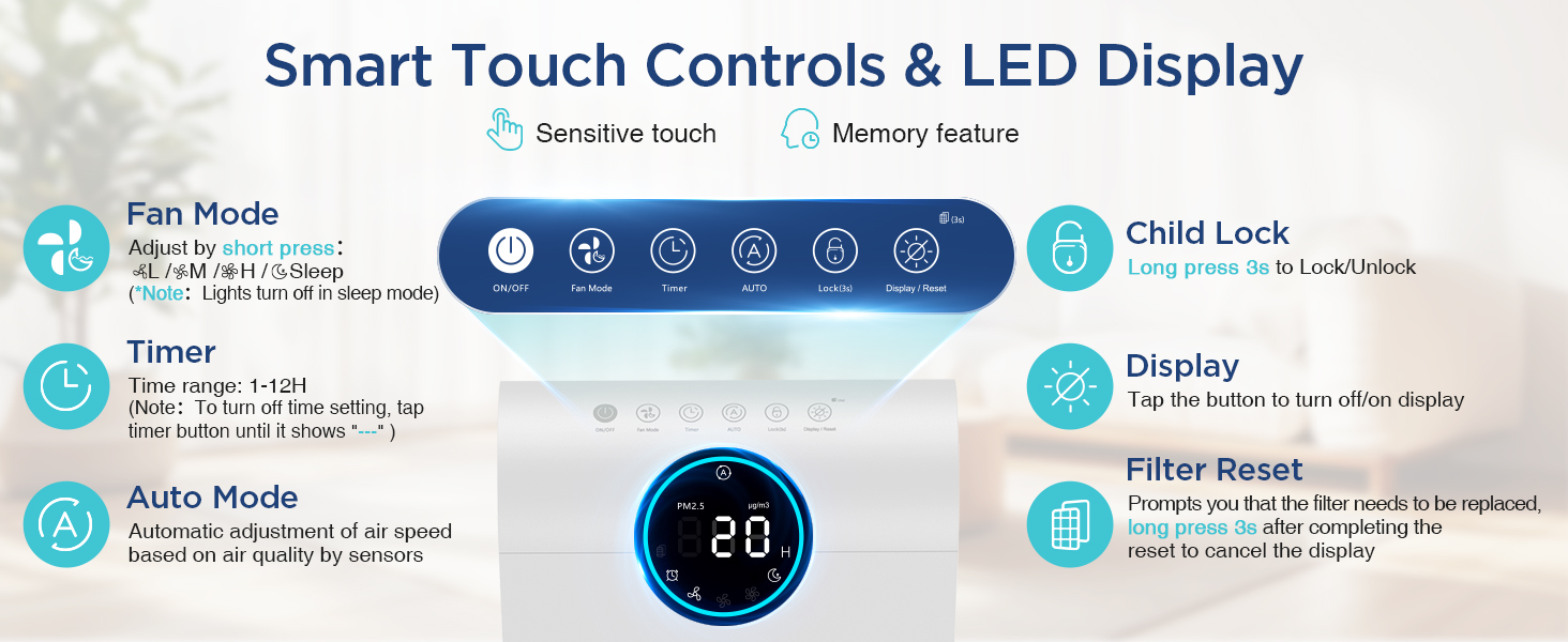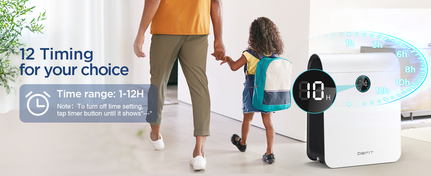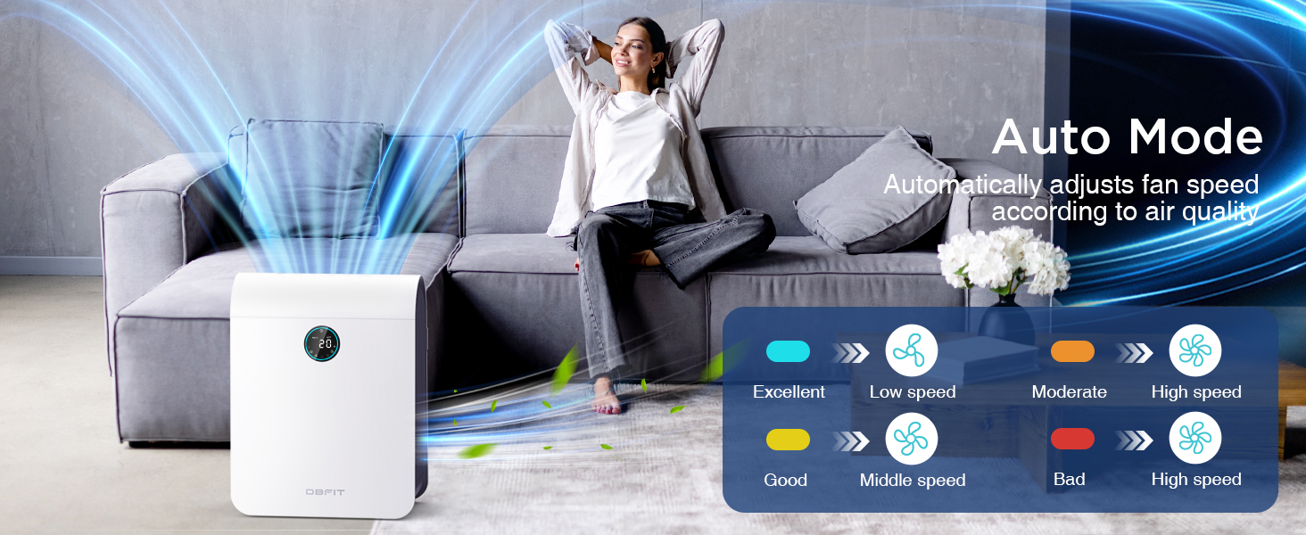 - 5 FAN SPEEDS & 12-HOUR TIMING: DBFIT air cleaner for pets has 5 fan speed modes (Auto/Low/Med/High/Sleep), you can adjust fan speeds according to your needs to achieve the best effect. When you don't know which fan speed to choose, you can turn on auto mode, which can help you choose the right wind speed, smart and energy-saving. You can also turn on the timer mode of the room air purifier when you are sleeping or going out, the time can be freely selected from 1-12H.