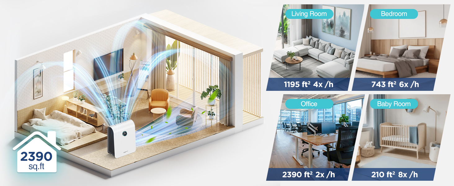 - HIGH-EFFICIENCY & LARGER COVERAGE FOR PET LOVERS: DBFIT AP-M1419 air purifiers for home large room can effectively purify air pollutants and cover an area up to 2390 sq ft, refresh a room of 210 ft² rapidly in just 8 minutes. Superior odor-absorbing filter, it can trap airborne pet hairs and odors more easily. High-efficiency HEPA air purifier captures 99.97% of airborne particles, ensuring a smoke-free, dust-free, allergen-free, and odor-free environment for you and your family!