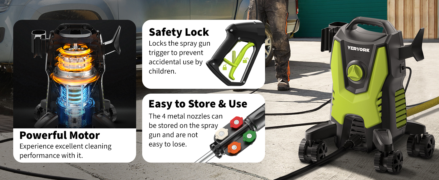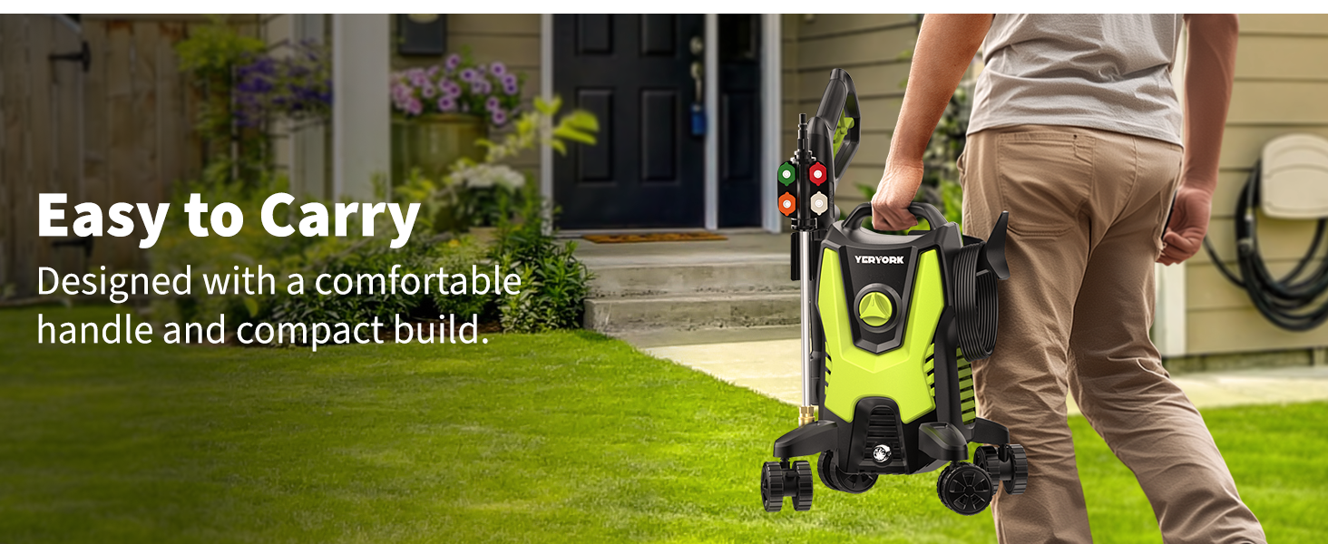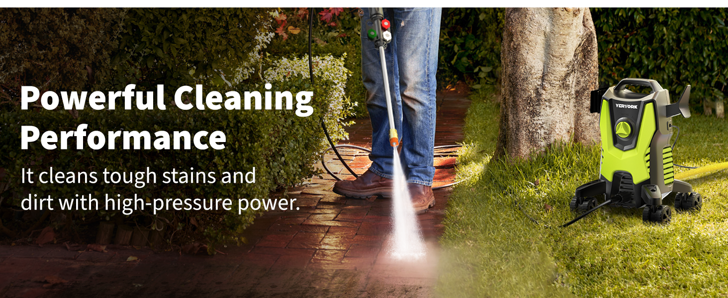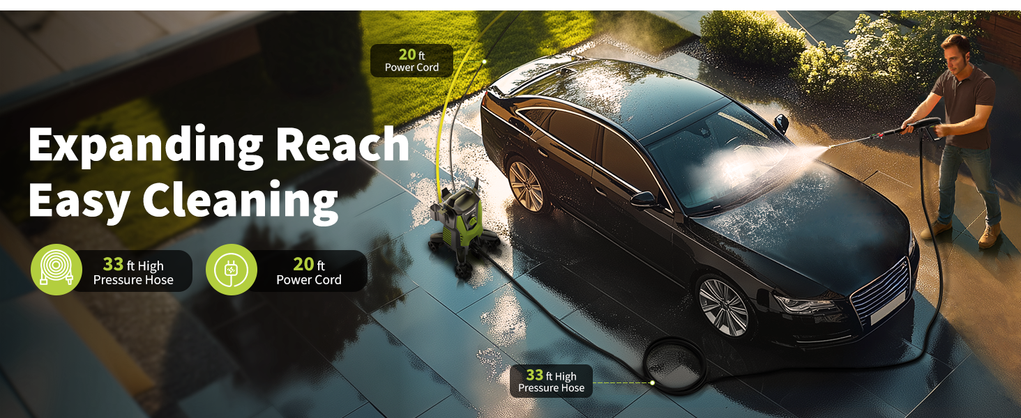 - 【Extended Reach & Versatility】With a 20 ft power cord and a 33 ft hose, this Yeryork pressure washer offers the flexibility to cover large areas with ease. It also supports water intake from faucets, buckets, or pools, ensuring flexibility for various cleaning needs.
