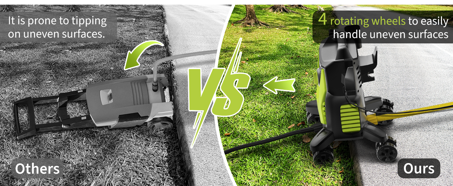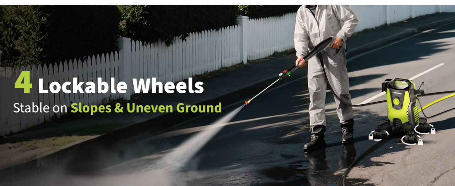 - 【Anti-Tipping & Lockable Wheels】Designed for maximum stability and smooth maneuverability, this electric power washer features four 360° rotating wheels for effortless movement on any surface. Each wheel is equipped with a locking caster, ensuring secure placement even on slopes.