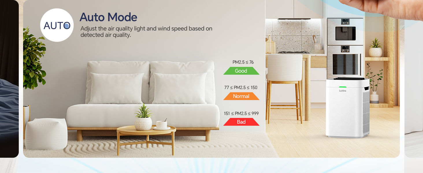 - πͺππππ πΉπππ-ππππ π¨ππ πΈππππππ - The pet air purifier features a PM2.5 particulate sensor that monitors real-time air quality through color-coded indicators: Green (Good), Orange (Minor Pollution), and Red (Severe Pollution). In auto mode, it automatically adjusts fan speed based on sensor readings. (Long-press power button to activate/deactivate auto mode)
