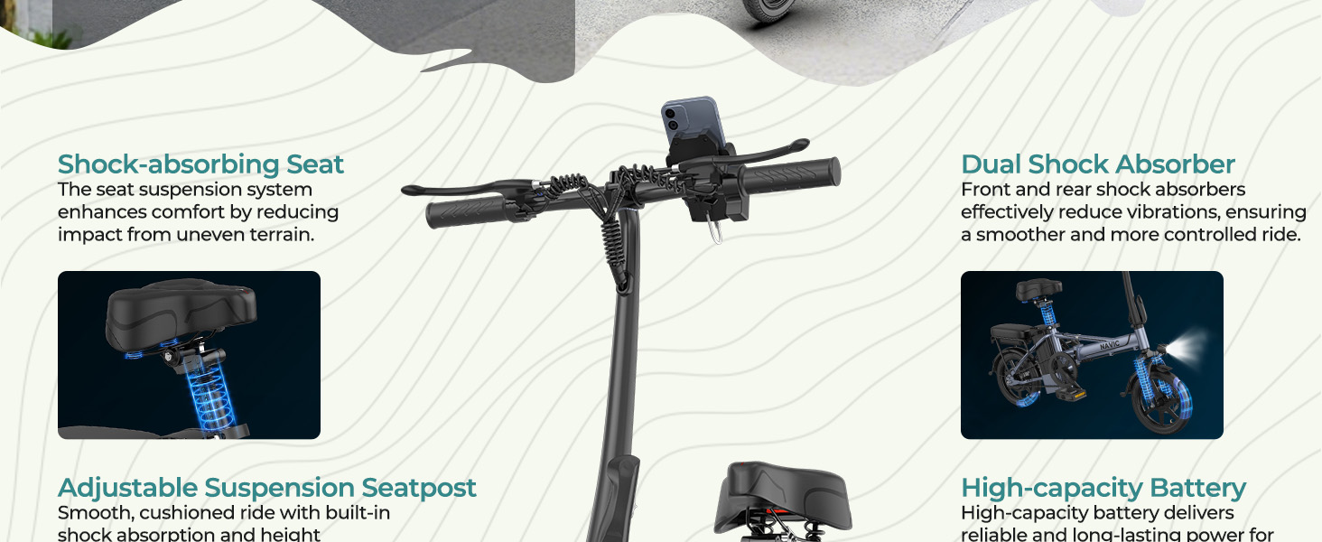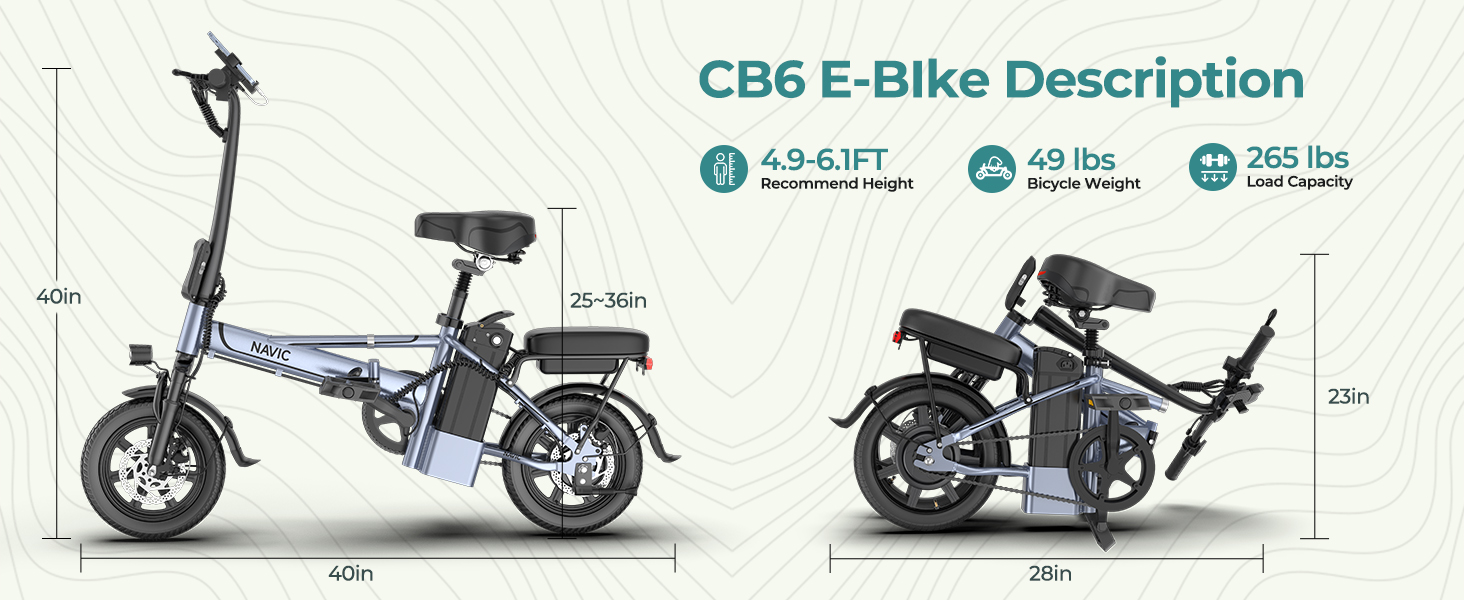 - FOLDABLE & COMFORTABLE DESIGN: The CB6 foldable e bike quick-folding frame allows for easy storage and transport, whether in a car trunk, apartment, or office. The ergonomic adjustable seat and built-in phone holder provide enhanced comfort and convenience, while 14-inch pneumatic tires and shock absorbers ensure a smooth ride on any terrain.