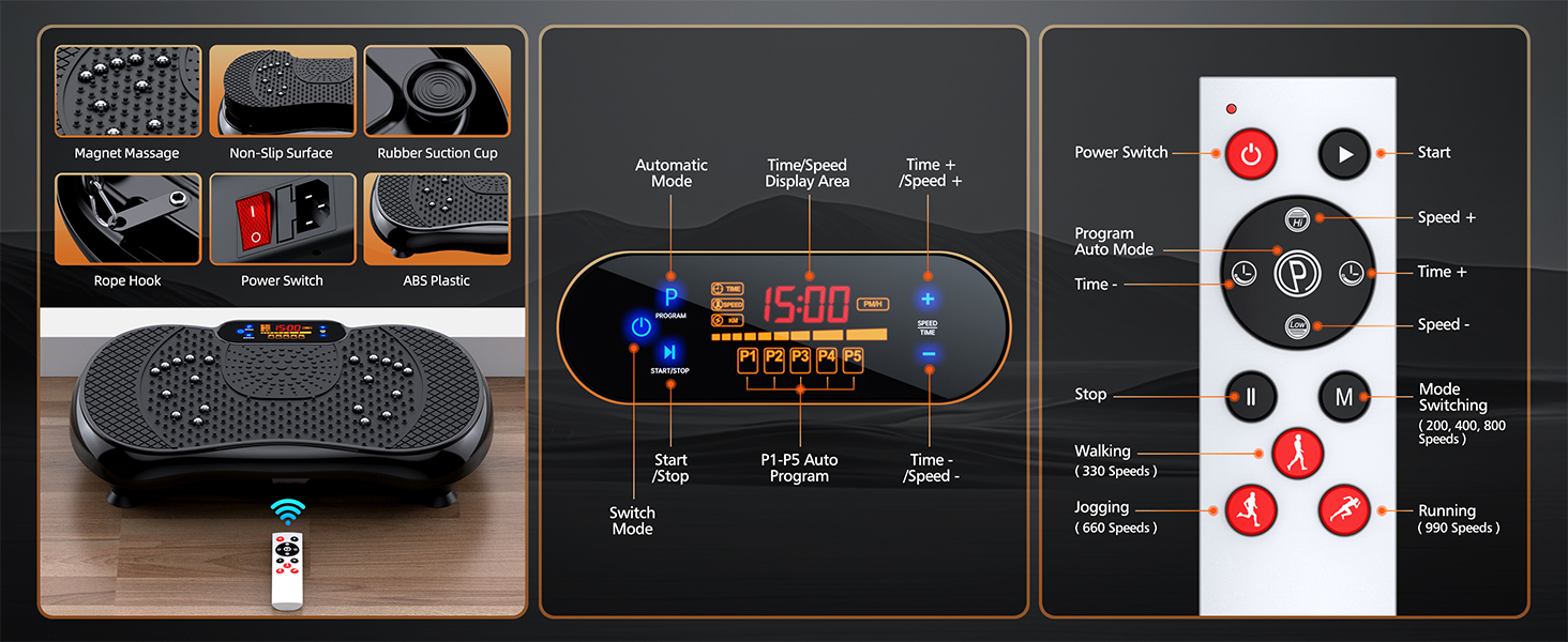- 【SAFETY & PROTECTION MEASURE】To prevent the users from slipping and considering some floor materials that are easily stained, it is recommended to place the vibration plate on a rubber anti-slip pad. That will bring users the better experience while using this item.