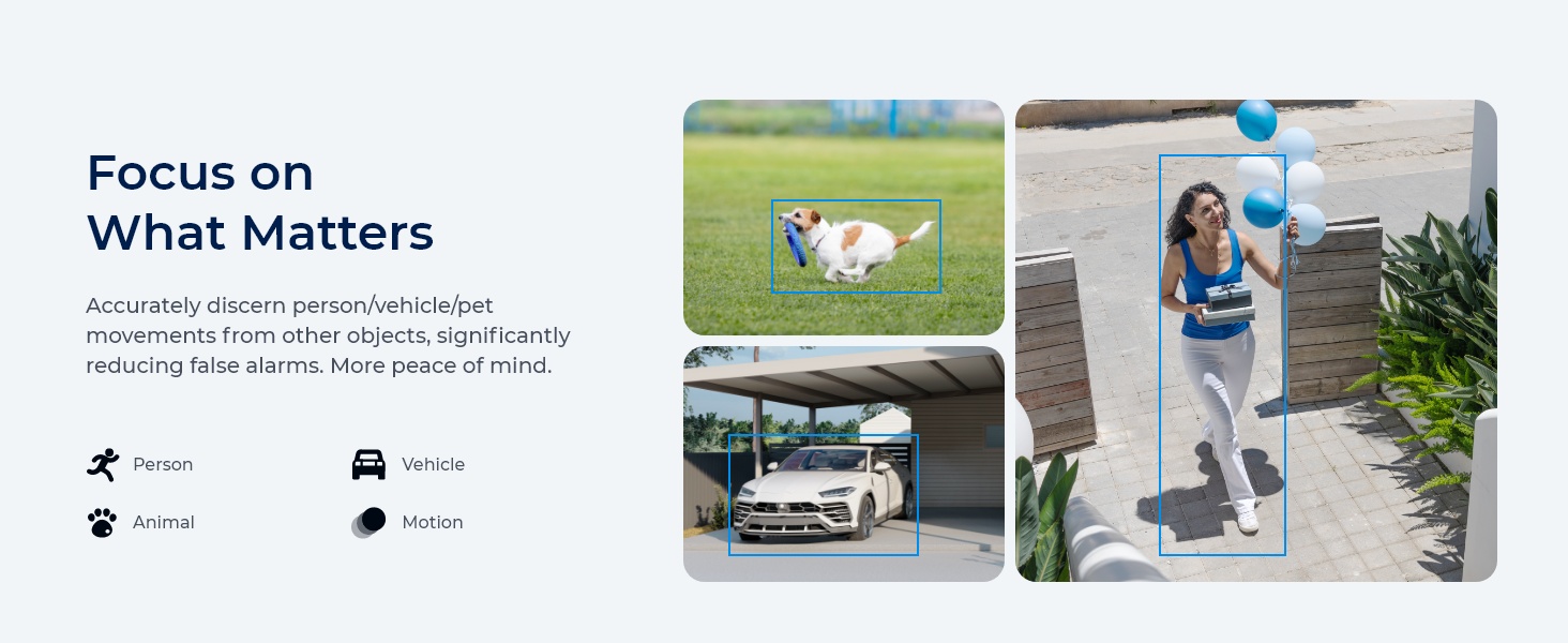 - Smart Detection Reduces False Alarms: Equipped with an advanced sensor and intelligent algorithms, this battery camera brings more accurate alerts, and you can set the detection sensitivity and zones for person/vehicle/pet motion to further reduce unwanted alerts.
