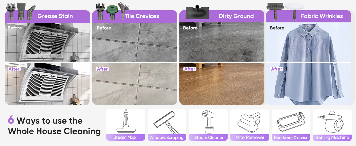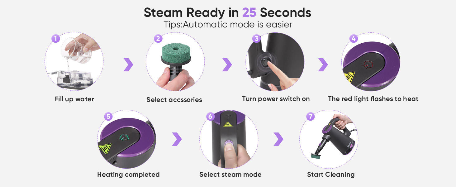 - Powerful Steam Cleaning--Heat up quickly in 25 seconds, release hot steam effectively to clean dirt, stains and grease without leaving residue, making daily chores a breeze
