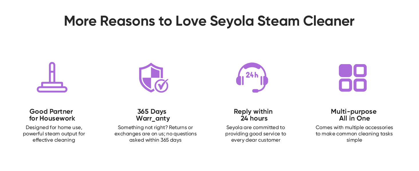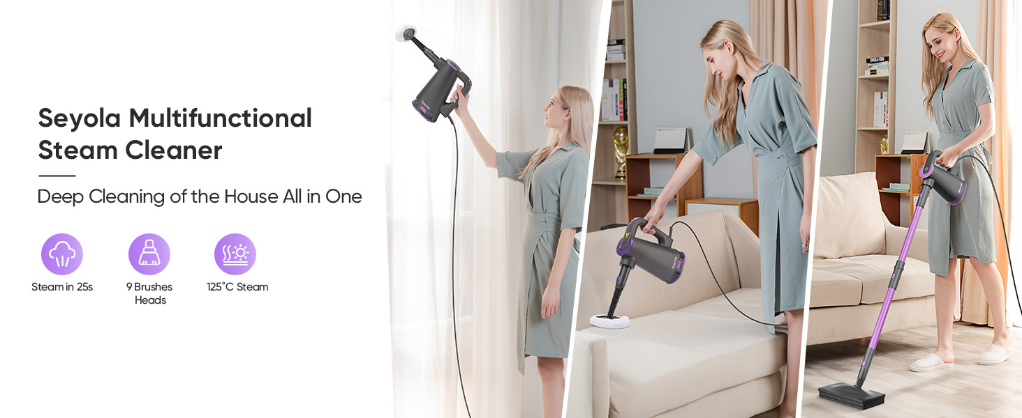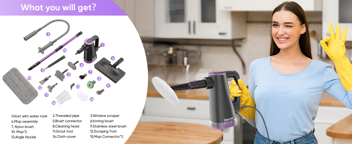 - 9 in 1--Seyola multifunctional steamer mop cleaner comes with exclusive 9 brushes attachments, including extra 2 extension tubes to meet your different needs. All-in-one cleaning for the whole house, suitable for various surfaces such as tiles, hardwood floors, carpets, sinks, stoves, windows, sofas, toys, and cars