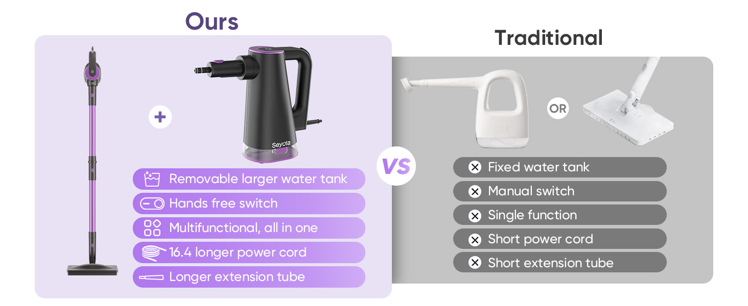 - Large Removable Water Tank--Seyola steam cleaner handheld features an extra large water tank of 12.5OZ capacity, which allows you to focus on cleaning, no need to frequently add water, more efficient and effective cleaning