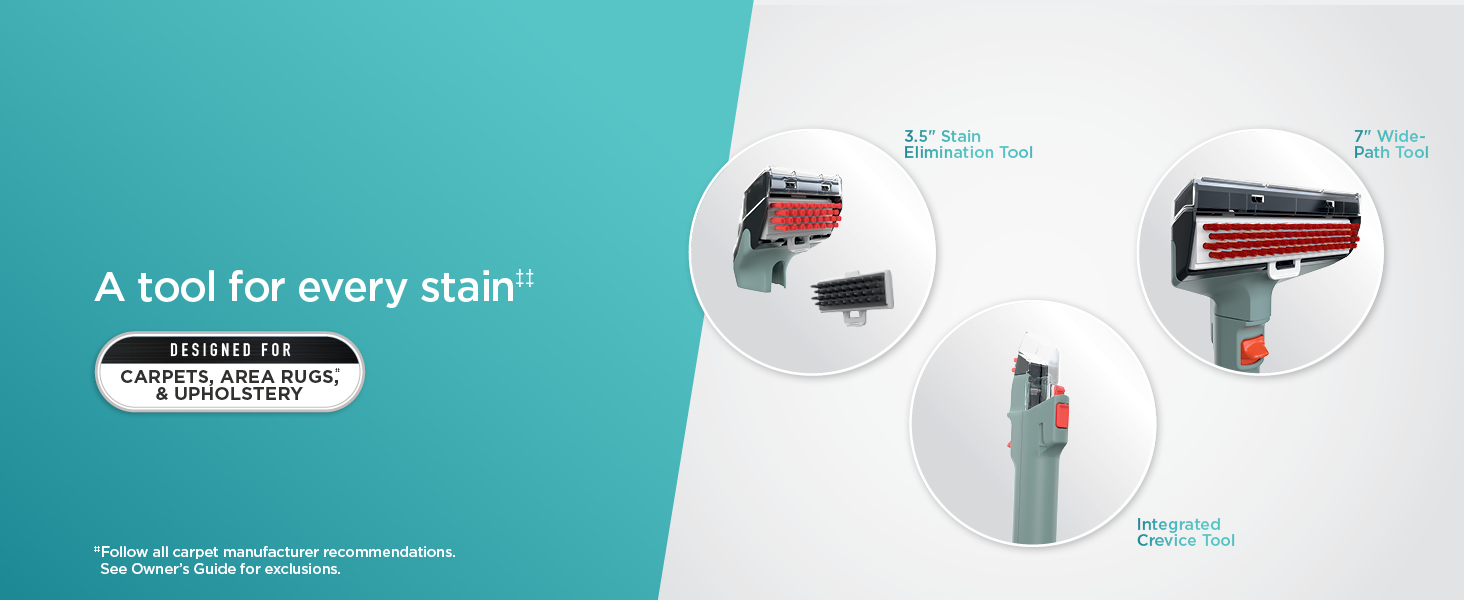 - SUITE OF ACCESSORIES: Includes three specially designed tools to tackle tough spots and stains on carpets, area rugs, upholstery, and more.