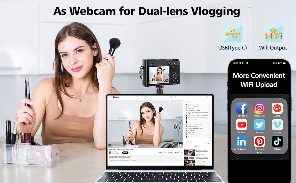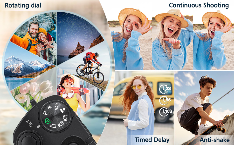 - Effortless Selfies & Instant WiFi Sharing – Capture stunning shots with the dual-lens digital camera, allowing seamless switching between front and rear camera for perfect selfies and vlogging. Vlogging camera with WiFi, transfer photos and videos instantly to your smartphone for quick social media sharing. Use your phone as a remote control to frame, shoot, and record hands-free, making group photos and solo vlogs easier than ever.
