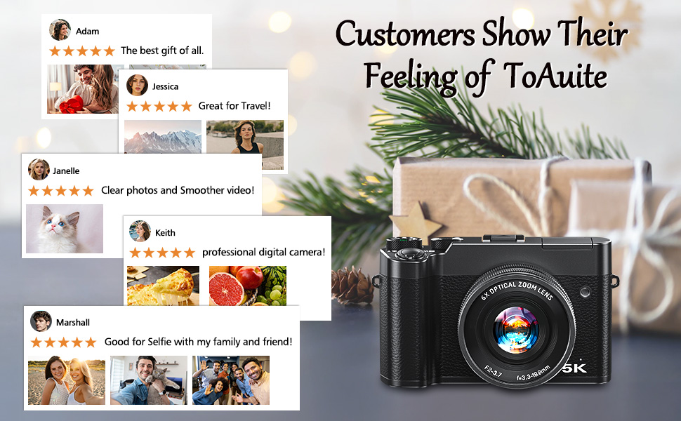 - Complete Kit & Perfect Gift Choice – ToAuite digital camera kit includes a 64GB SD card, two batteries, a Type-C cable, a camera bag, and a lanyard...—everything you need to start shooting right away. Whether for birthdays, holidays, anniversaries, or special occasions, this feature-packed digital camera for 5K anti-shake video and photography is the perfect gift for anyone.