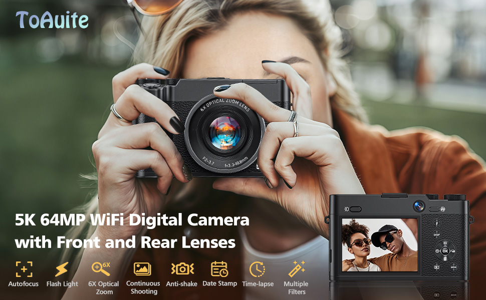 ToAuite Digital Camera, 6X Optical Zoom & WiFi, 5K 30FPS 64MP Vlogging Camera