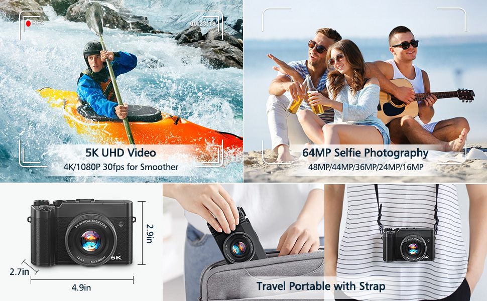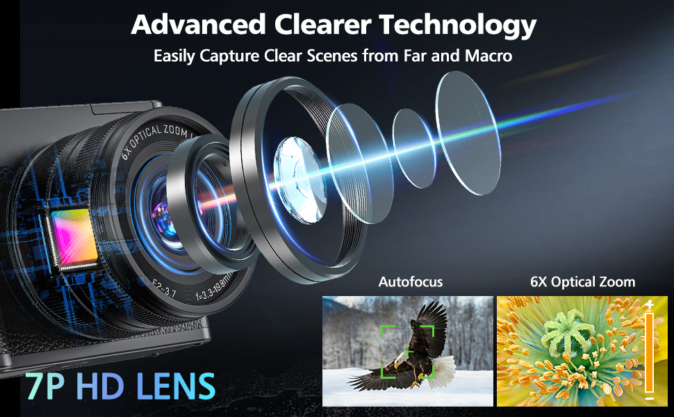 - Crystal-Clear 5K Video & 64MP Photography – 6X optical zoom and autofocus capture every detail with stunning clarity using our 5K digital camera, improving the smoothness of digital camera videos with 30FPS and delivering 64MP photos. The advanced autofocus camera for photography and video ensures crisp and vibrant macro images. With 6X optical zoom, you get close to distant subjects while maintaining superior image quality—ideal for travel, portraits, and landscape shots.