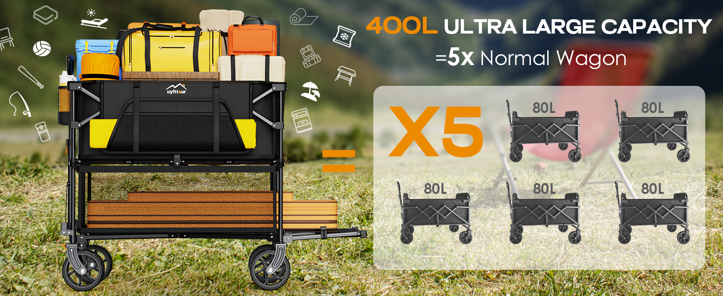 - Enhanced Capacity of 400L: Accommodate all your essentials in a single trip, minimizing the need for multiple journeys! This exceptional collapsible wagon surpasses other wagons by 5X more efficient and stands out as the epitome of efficiency! But wait, there's more! With a double-decker design, it boasts the most stable structural frame and is crafted from 600D waterproof oxford fabric, enabling it to support up to 485 lbs with ease.