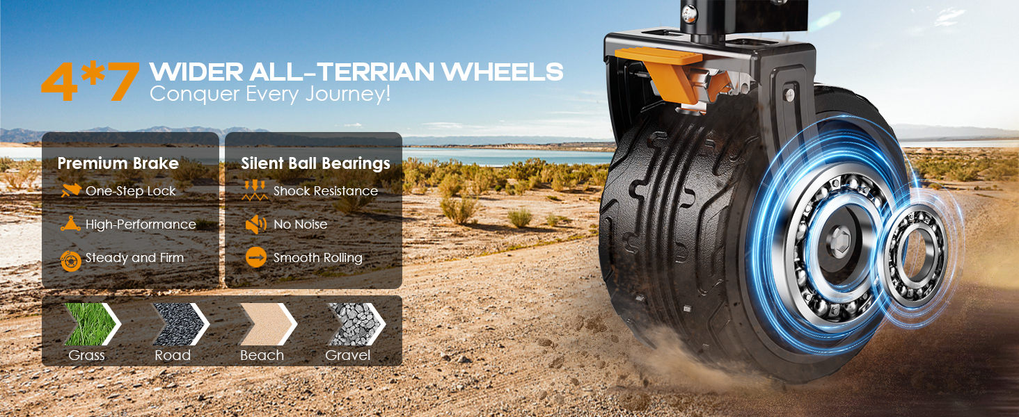 - Experience Unmatched Durability: Dominate any terrain with the robust 7x4 inch all terrain wheels at your disposal! The front wheel brakes grant you complete control, ensuring seamless stops and starts on your thrilling escapades. Prepare yourself for an upcoming adventure like no other! Kindly notice that these wheels are not recommended for soft sand.
