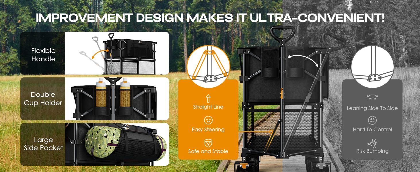 - Superior Additional Capabilities: We've paid more attention to what our customers need, and we've come up with some other thoughtful designs. We've added large side pockets for your umbrella and books, and two cup pockets for your drinks. We've got a carry-on bag so you can keep your wagon safe while you're traveling and having fun outdoors.