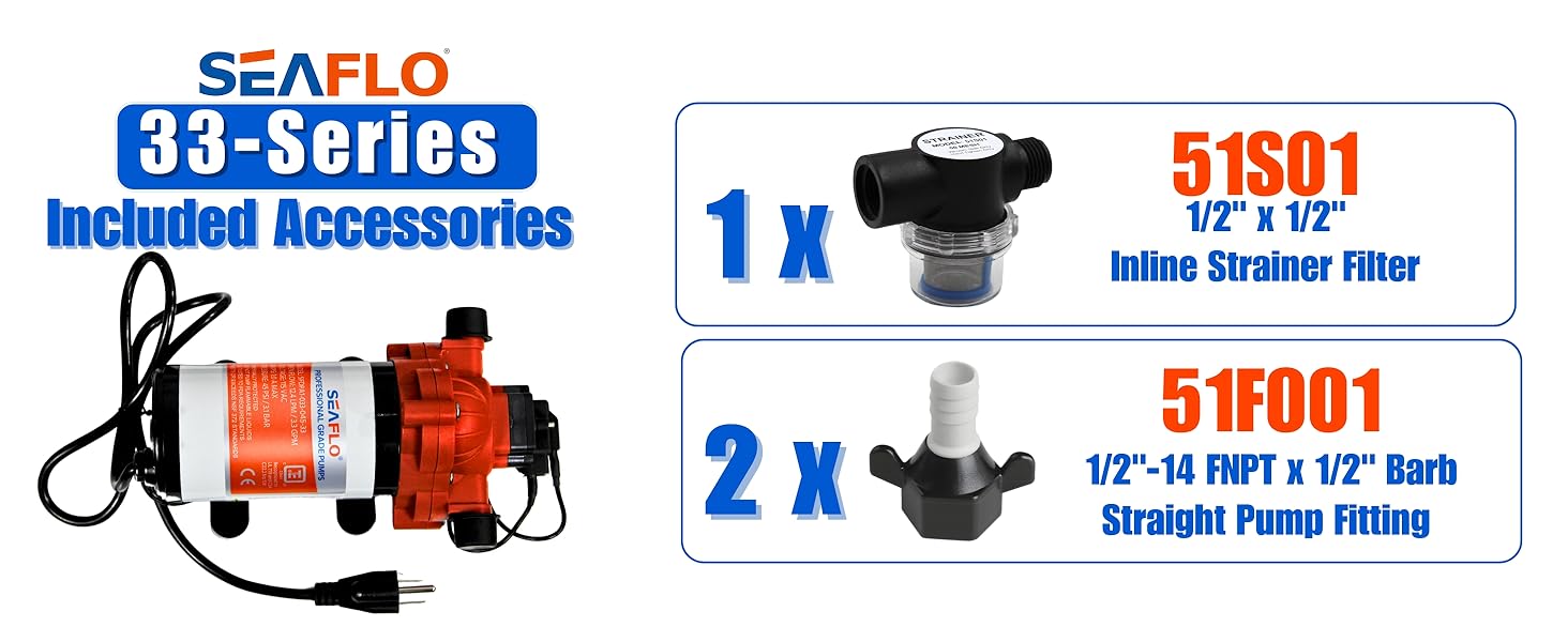 - (1) SEAFLO 33-Series Diaphragm Pump (1) Set of Instructions (2) 1/2" Barbed Hose Adaptors (1) 50 Mesh Inlet Strainer