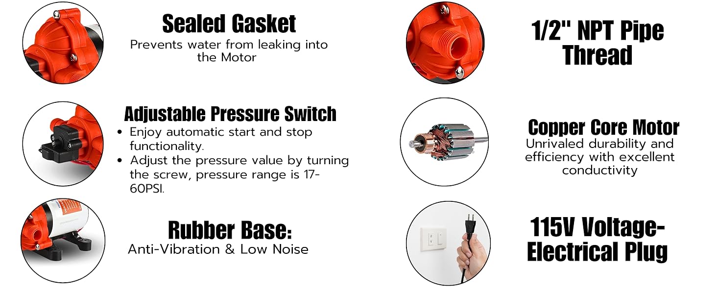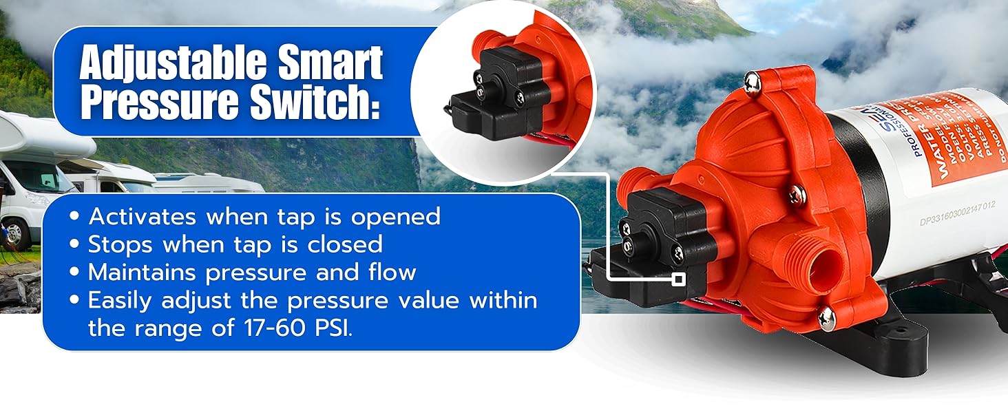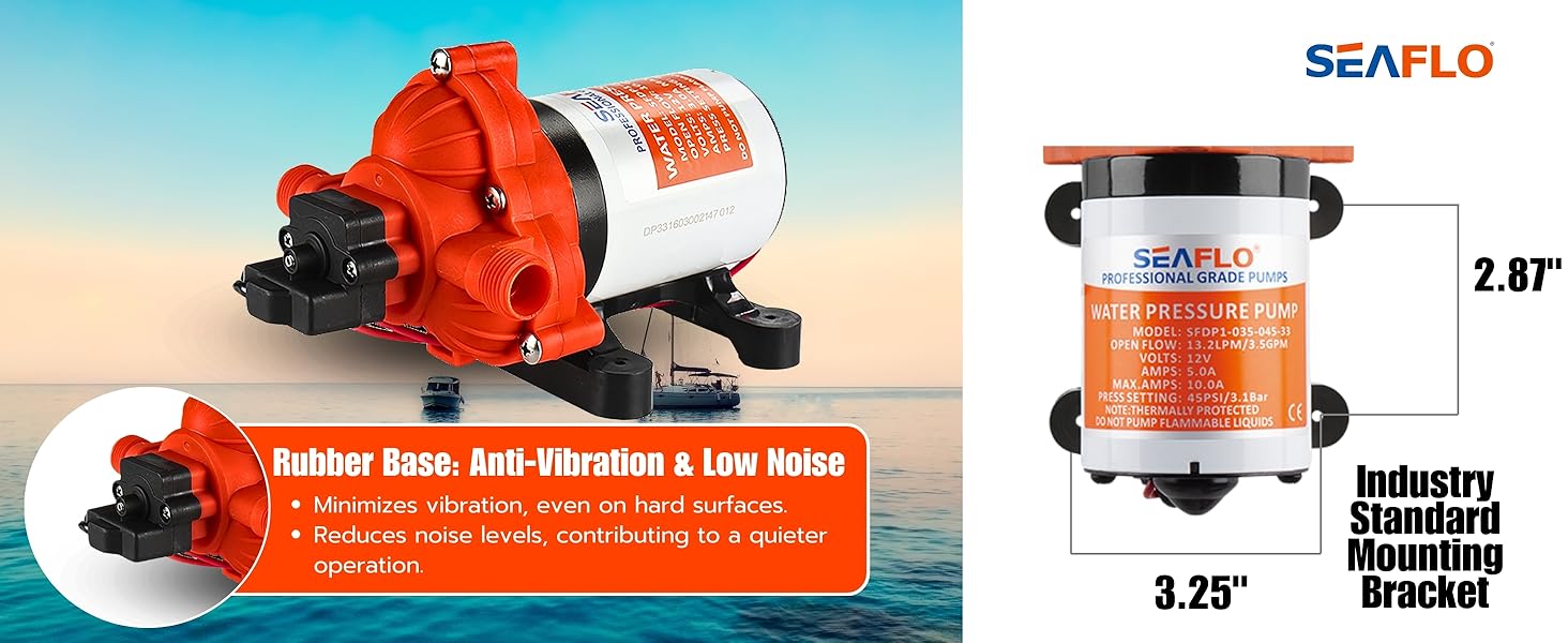 - Quiet Operation with Anti-Vibration Features: Noise reduction is a key consideration in the design of the SEAFLO 33-Series pump. The pump operates quietly, comparable to an indoor electric fan, making it ideal for use in close quarters such as RVs and boats. The semi-rigid rubber mounting base minimizes vibrations, further reducing noise and preventing damage to the pump and surrounding structures. This feature ensures a peaceful and comfortable environment, whether you're relaxing on your boat or camping in your RV.