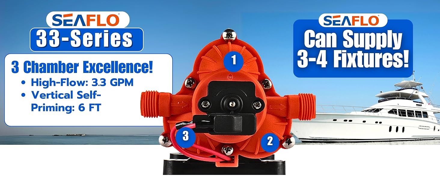 SEAFLO 33-Series 115v Water Diaphragm Pump is the ultimate solution for reliable and efficient water flow in your RV, marine, or boat system. This advanced three-chamber diaphragm pump offers high-performance with up to 3.3 gallons per minute (GPM) and water flow for up to 3-4 fixtures.33-Series Technical Specifications