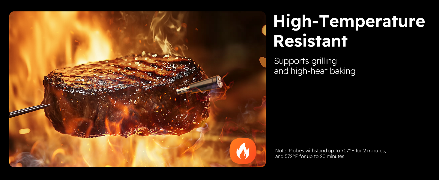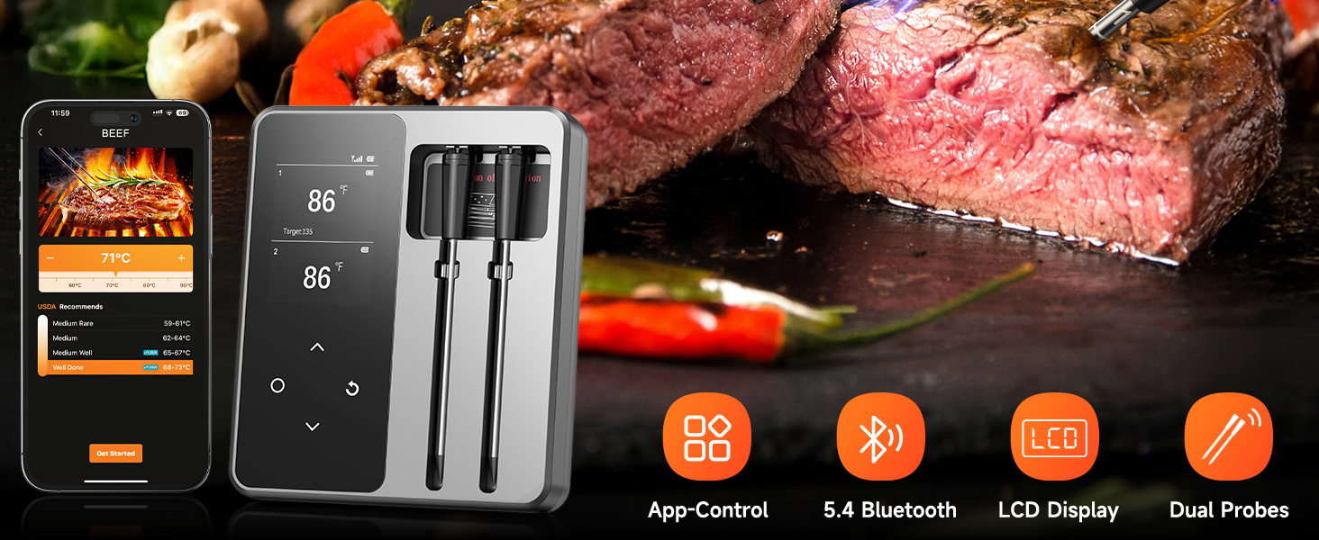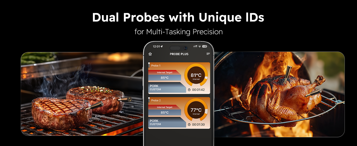 - Dual-Probe Design for Multi-Tasking: Cook like a pro with two probes that allow you to monitor multiple cuts of meat at once, or track different cooking zones—perfect for complex meals or big BBQ sessions