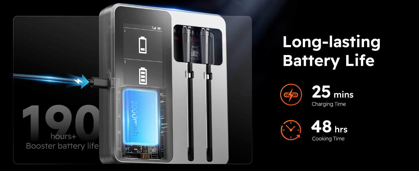 - Powerful Battery Life for Long Sessions: Keep the action going with an impressive battery life that supports long cooking sessions. Repeaters can run for 190 hours on a 3-hour charge and probe can run for 48 hours on a 25 min charge. No more interruptions—this thermometer is ready for extended grilling marathons