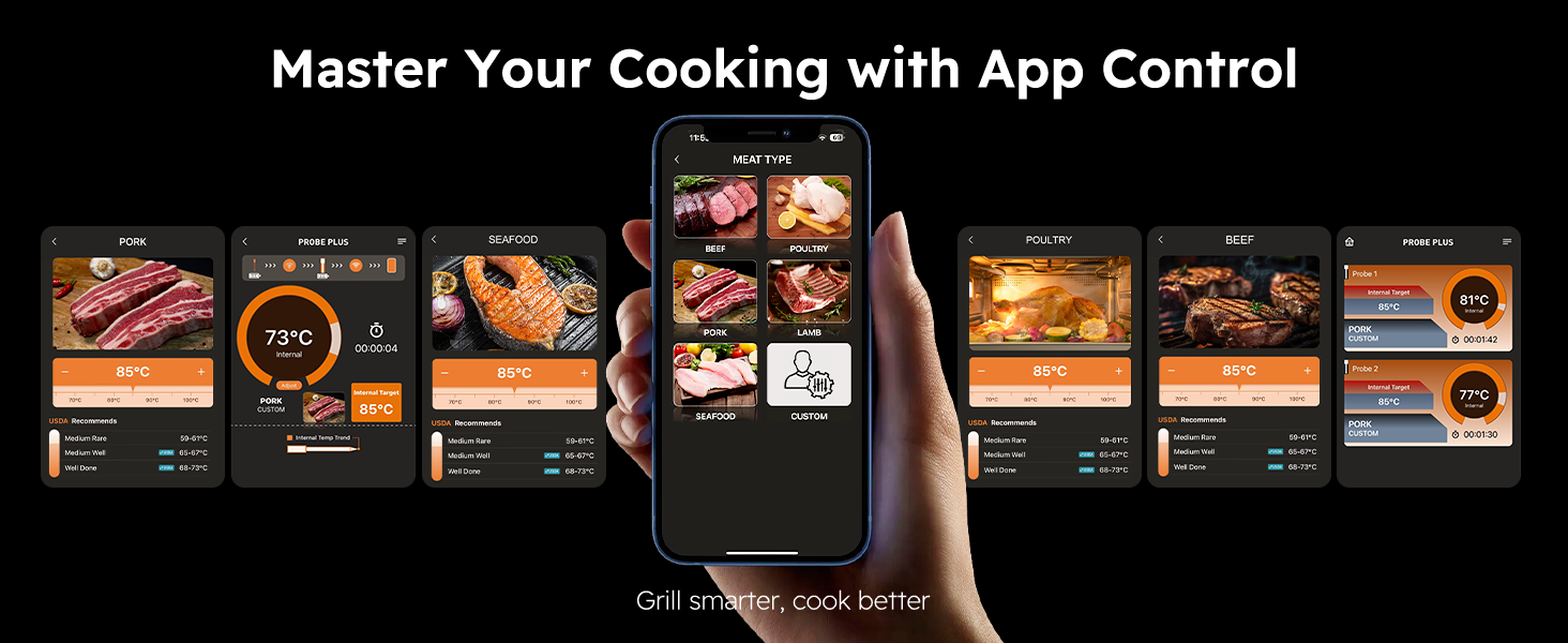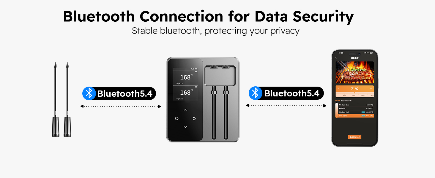 - Bluetooth Connection Protects Privacy: Stay connected and secure with advanced Bluetooth5.4 technology that ensures stable data transmission without compromising your privacy. Enjoy a smooth grilling experience with no drop-offs or interruptions