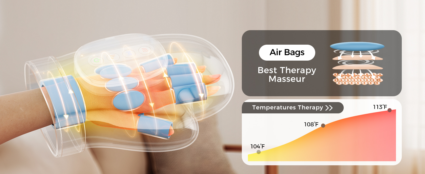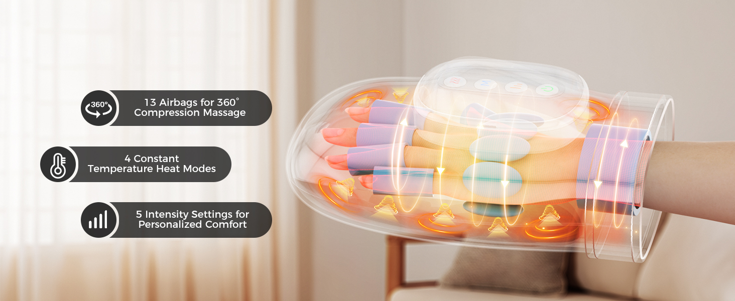 - Professional Hand Massager: Hand massager equipped with 13 TPU airbags, 3 massage modes (Health/Soothing/Vitality), 4 Temperatures modes (113°F/122°F/131°F/140°F), 5 Compression Models, 8-10 seconds fast heating, 15-minutes automatic shut-off timer.