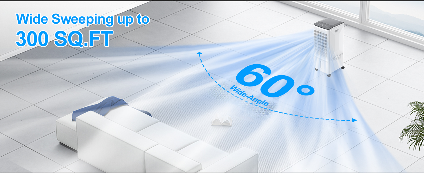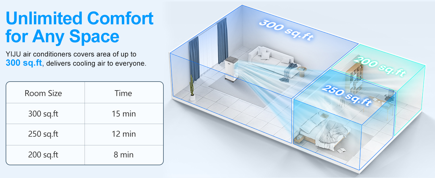 - 60° Oscillation Covers Up to 300 Sq. ft: With a max speed of 28 ft/s, the YIJU portable air conditioner can efficiently cover an area of up to 300 sq.ft. The 60° automatically and 120° manually swing ensuring even cooling the entire room. What's more, equipped with the top LED display and remote control with a range of up to 26ft makes operation a breeze