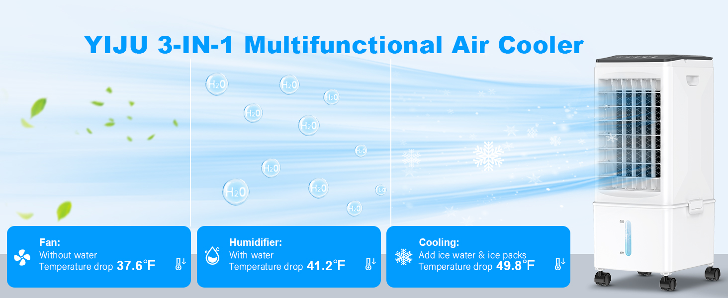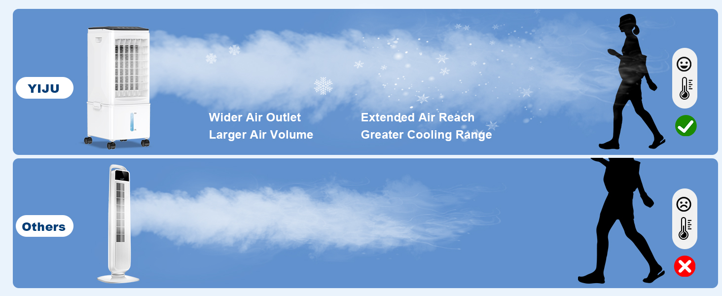 - 2025 Advanced Cooling Technology: Featuring advanced 2025 cooling technology, YIJU portable air conditioners are powered by upgraded motors, innovative air duct design, and high-density cooling pads. Delivers impressive 2500 CFM airflow and rapidly lowers the ambient temperature by 50-59℉. Tip: Enhance the cooling effect by adding frozen ice packs to the water tank(Tested at 95°F in the lab, the cooling effect varies based on indoor humidity)